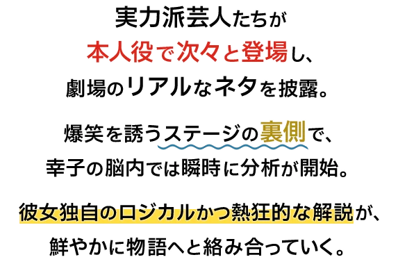 実力派芸人たちが本人役で次々と登場し、劇場のリアルなネタを披露。爆笑を誘うステージの裏側で、幸子の脳内では瞬時に分析が開始。彼女独自のロジカルかつ熱狂的な解説が、鮮やかに物語へと絡み合っていく。