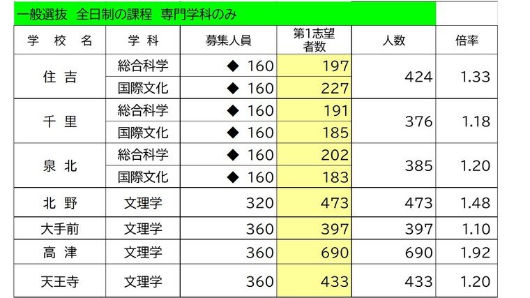 全日制普通科の倍率は1.04倍で、こちらも去年の1.16倍を下回ります。学校別の志望倍率は高いところから、茨木1.96倍(茨木市) 高津1.92倍(大阪・天王寺区) 春日丘1.87倍(茨木市) 三国丘1.74倍(堺市) 山田1.68倍(吹田市)となっています。