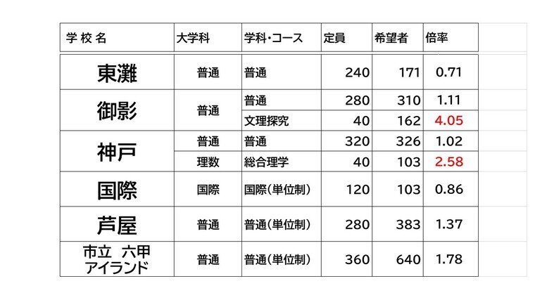加古川東高校は2倍超 明石高校は1.13~1.73倍
