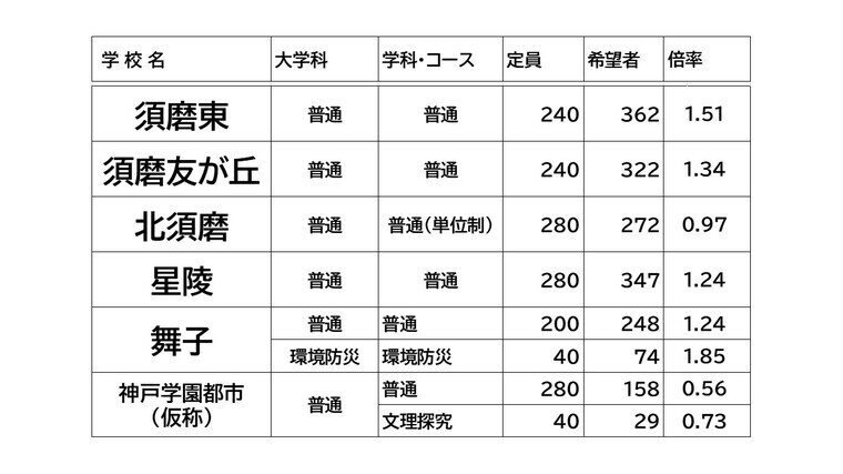 舞子高校(環境防災)は1.85超 神戸翔風は1.71倍