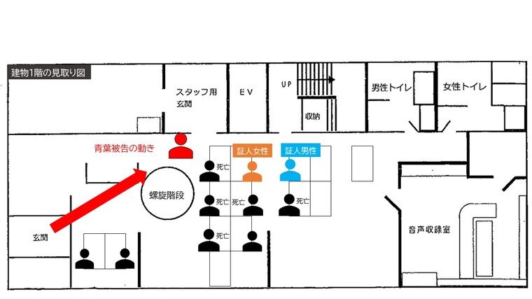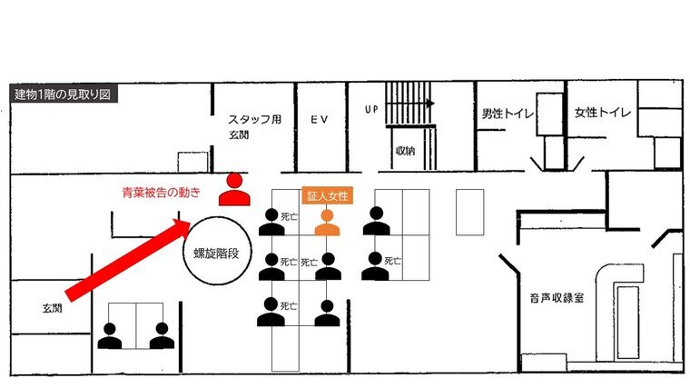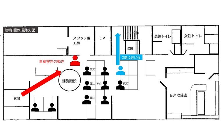 男性は当日、1人目の女性証人の背中合わせの席で事務作業にあたっていた。スタジオ2階に上がろうと階段へ向かったときに青葉被告に気づいたという。