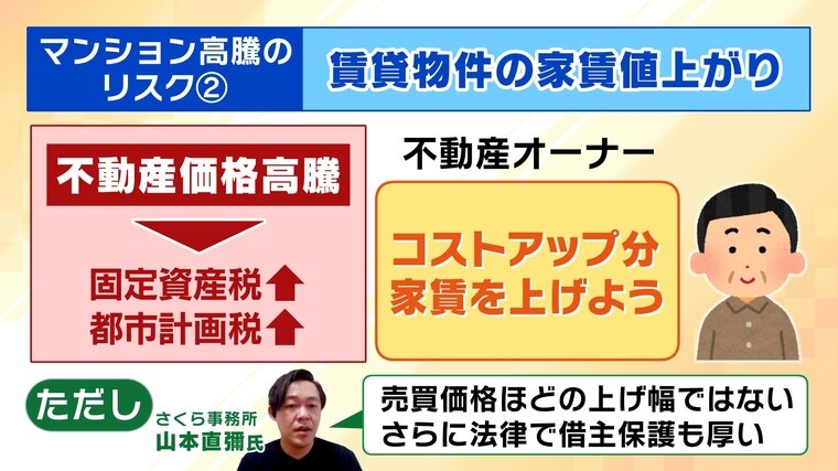 不動産価格が高くなると、固定資産税や都市計画税などの税金も上昇。その結果、不動産オーナーは「コストアップ分家賃を上げよう」と考えざるを得なくなります。ただ、家賃については売買価格ほどの上げ幅ではなく、さらに法律で借主は手厚く保護されます。