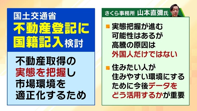 これについて山本氏は「実態把握が進む可能性はあるが、高騰の原因は外国人だけではない。住みたい人が住みやすい環境にするために今後データをどう活用するかが重要」と分析しています。