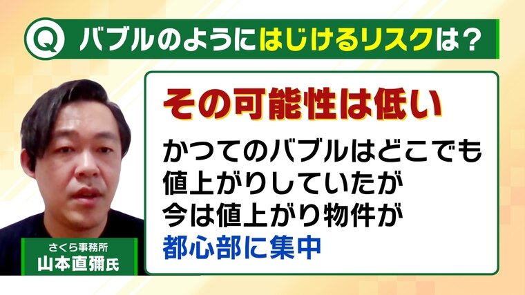 今回のマンション高騰。山本氏は「バブルのようにはじける可能性は低い」と指摘。その理由は「かつてのバブルはどこでも値上がりしていたが、今は値上がり物件が都心部に集中」しているからだと言います。