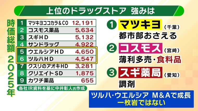 時価総額上位3社はそれぞれ強みを持っている一方、ウエルシア・ツルハは「独自の武器がない」と市場から評価されているようです。また、この2社はM&Aで成長を遂げたため「一枚岩ではない」と見られているといいます。