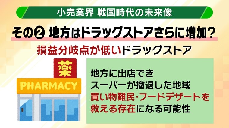 事業継続に必要な一般的な年間売り上げは、食品スーパーが7億円~10億円であるのに対し、ドラッグストアは3億円。損益分岐点が低いため地方に出店でき、スーパーが撤退した地域の「買い物難民」「フードデザート(食品の砂漠)」を救える存在になる可能性があるといいます。