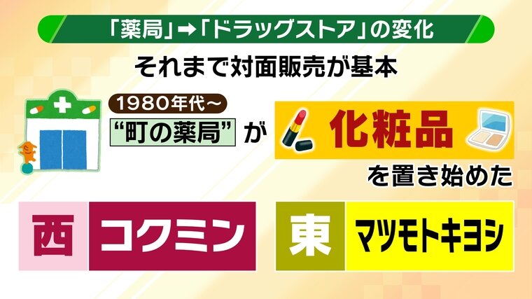 薬局がドラッグストアに変化したのは、1980年代以降。町の薬局が、それまで対面販売が基本だった「化粧品」を置き始めたことがきっかけでした。黎明期をけん引したのは、マツモトキヨシ(関東)、コクミン(関西)で、都市型のドラッグストアとして発展していきました。