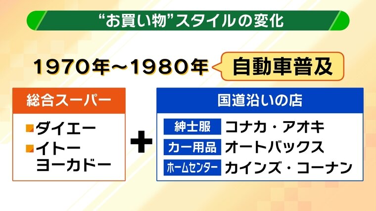 商店街・百貨店が併存していた時代を経て、自動車が普及した1970~80年代にはダイエー・イトーヨーカドーなどの「総合スーパー」が登場。同時期、コナカ・アオキ(紳士服)、オートバックス(カー用品)、カインズ・コーナン(ホームセンター)といった男性向けの「国道沿いの店」も広がり始めました。