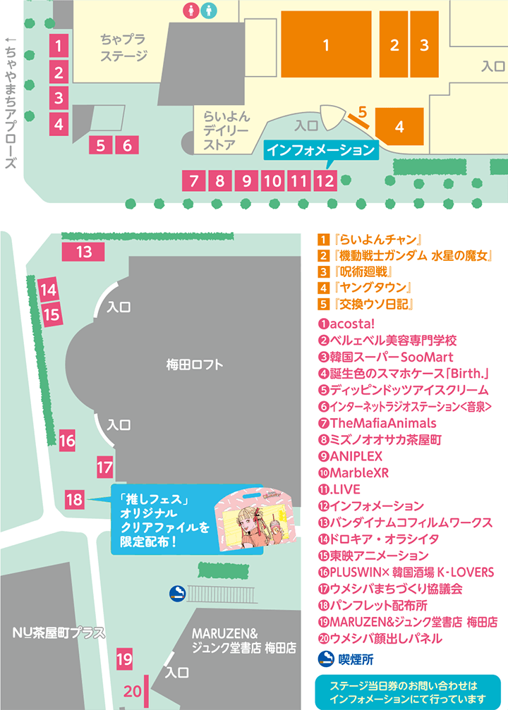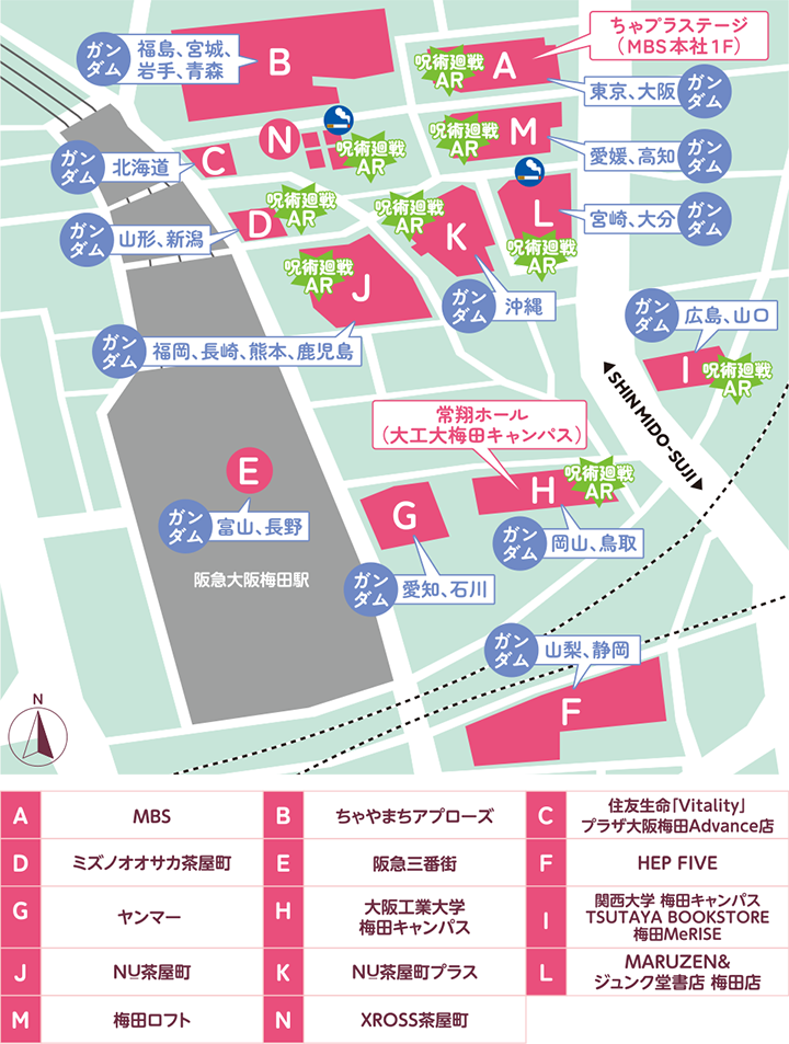 ![【MAP】MBS1階[A]-2、ちゃやまちアプローズ1階[B]、住友生命「Vi tali ty」プラザ大阪梅田Advance 店1階[C]、ミズノオオサカ茶屋町7階[D]、阪急三番街北館B1階[E]、HEP FIVE1階[F]、ヤンマー1階[G]、大阪工業大学 梅田キャンパス1階[H]、関西大学 梅田キャンパス8階[I]、NU_ 茶屋町3階[J]、NU茶屋町プラス1階[K]、MARUZEN&ジュンク堂書店 梅田店B1階[L]、梅田ロフト1階[M]](./images/contents/jujutsukaisen-map__info01.png)