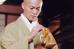 4.義明和尚に付き添われ、雲水衣からうぐいす茶(僧の階層によって色が違う)の大衣へと着替え、薄茶の袈裟をまとう。珊瑚の数珠、少し開いた中啓(ちゅうけい)という扇子を手にする。 |