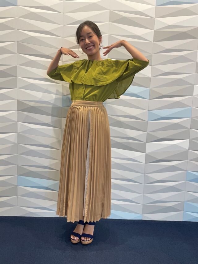グリーンフリルブラウス:she mo shelly ベージュ×メッシュレイヤードスカート:Lant Kalte (TEL)06-6367-3777