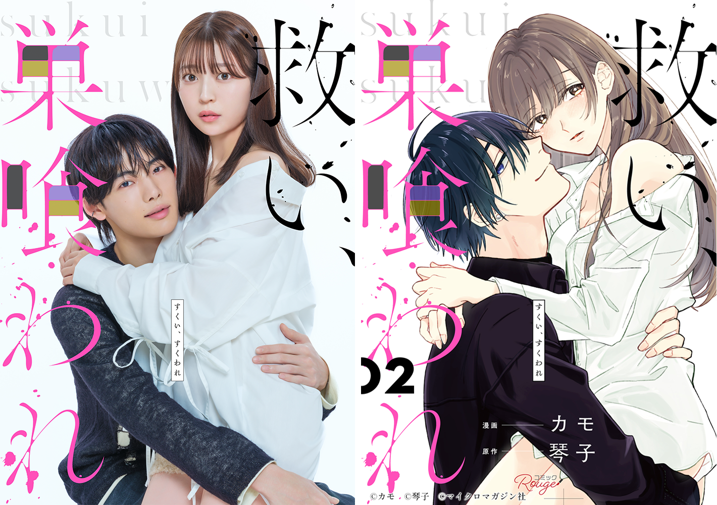 原作の表紙を模した、天(阪口珠美)を抱きかかえる千秋(NOA)の原作オマージュカットがこのたび解禁となりました。不敵な笑みを浮かべる千秋と、千秋に寄り添いながらも困惑するような天。